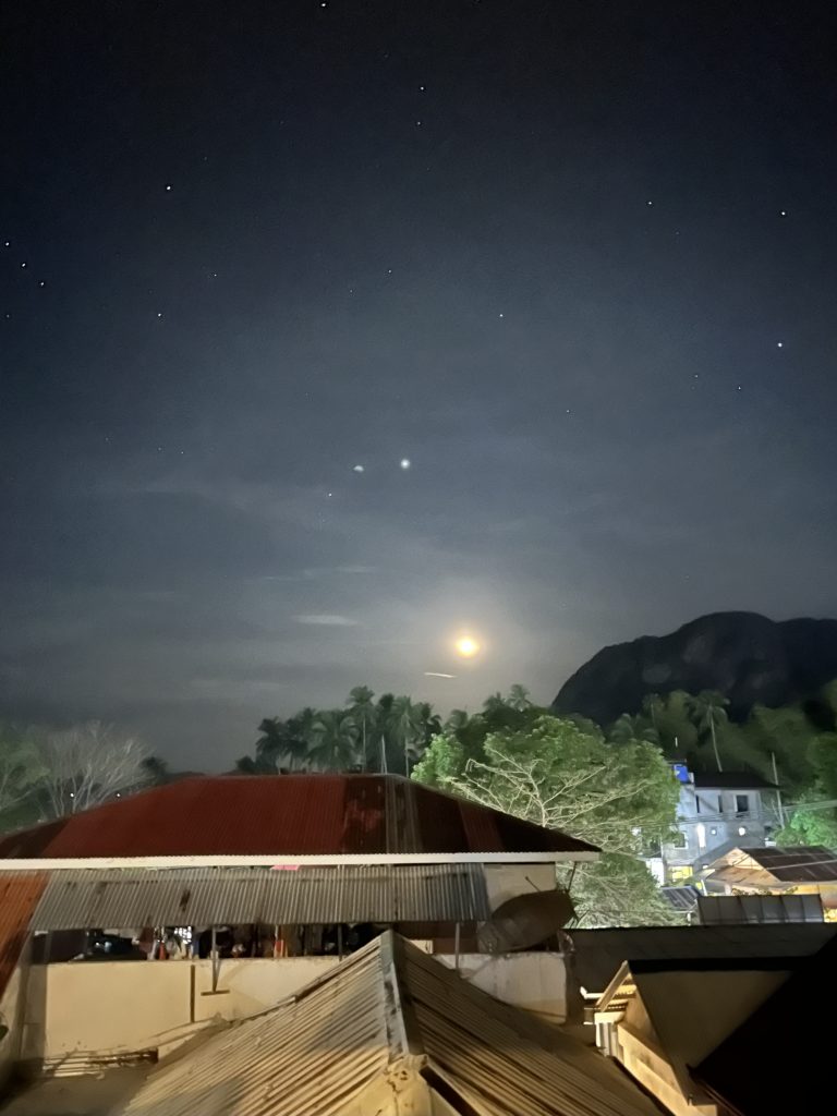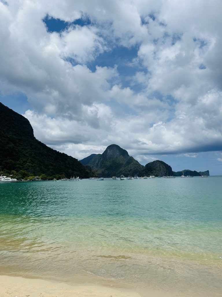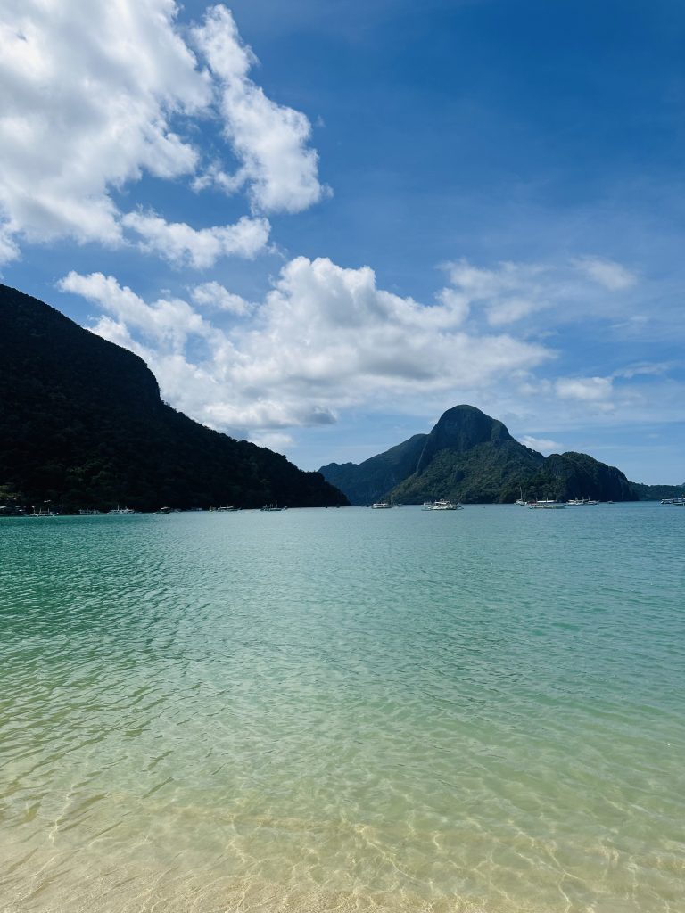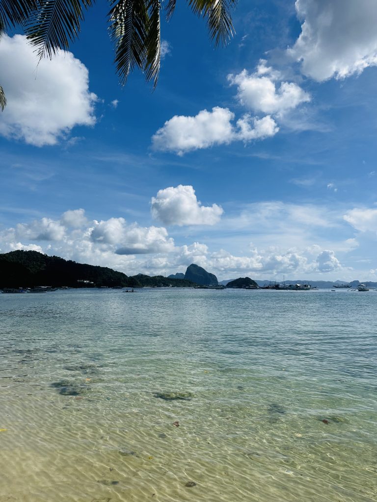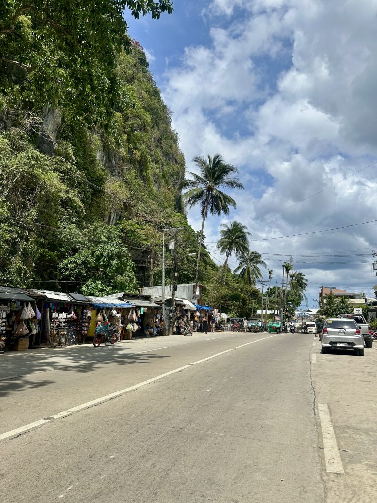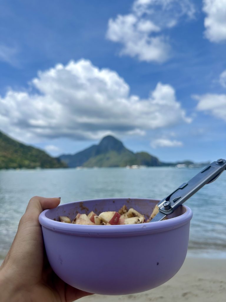 Am nächsten Morgen machen wir uns erstmal auf den Weg an den Strand von El Nido. Auf dem Weg dorthin versuchen wir Obst und Milch für unser Frühstück zu bekommen; relativ erfolglos. Pflanzenmilch gibt es hier nur mit mindestens 9g Zucker auf 100ml. Und Obst ist irgendwie auch schwierig. So landen wir am Ende mit zwei Äpfeln am Strand und mischen unser Müsli mit Wasser 🥹