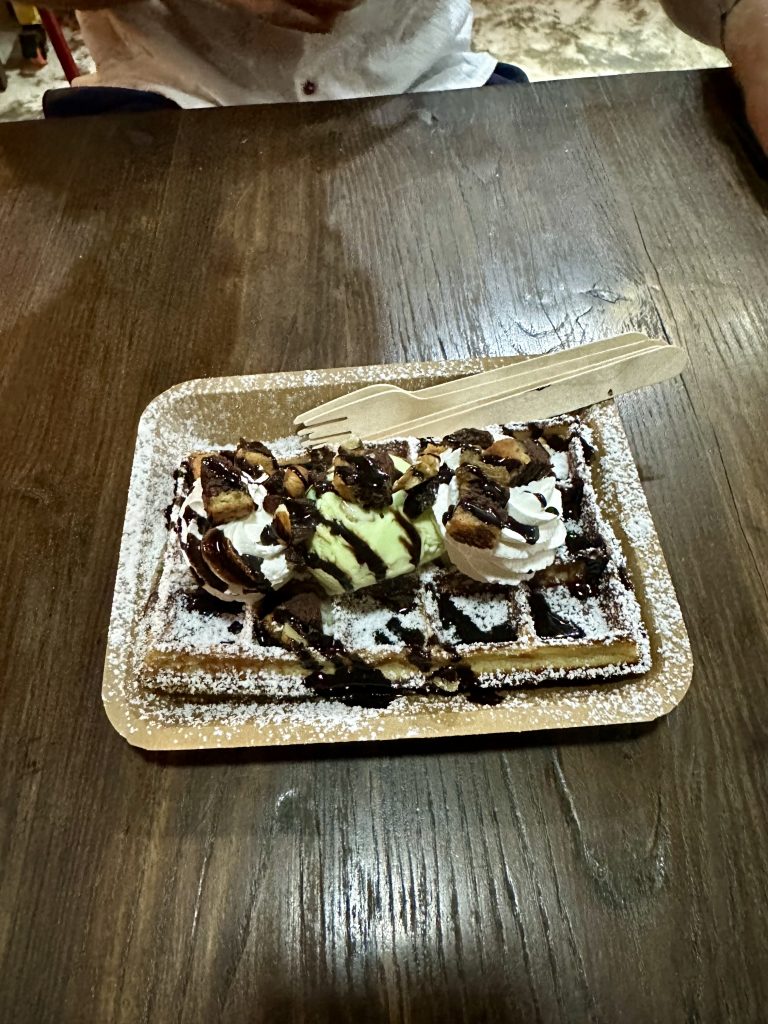 Der Besitzer des Lokals war dafür allerbest. Er hat gemerkt, dass vor allem ich nicht ganz so glücklich war und wollte sich entschuldigen, dass wir keinen Käse bekommen haben. Und so hat er uns kurzerhand eine belgische Waffel mit Pistazieneis kostenlos gemacht 🤩 und die war wirklich himmlisch!