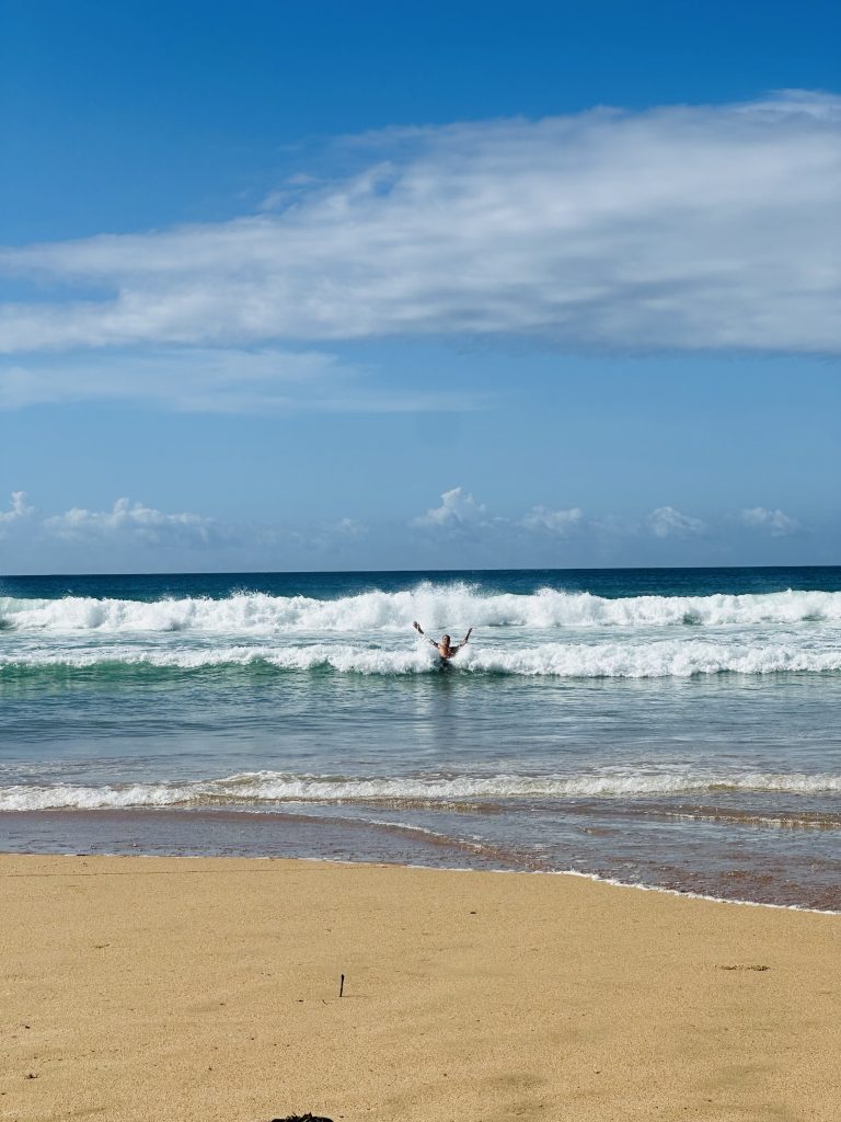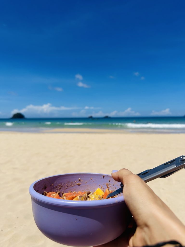 Hier ist uns aber ein richtiger Fauxpas passiert, und das nach über sechs Monaten auf Reisen! Häufig machen wir uns über Menschen „lustig“, die mit ihren Handtüchern super nah ans Wasser ziehen und mit der nächsten Welle weggespült werden. Da es an diesem Tag so windig war, haben wir uns auch relativ weit nach unten gelegt – denn dort ist der Sand fester und windet dann nicht so auf unser Obst. Gut, dass wir unser Essen schützen wollen, denn als ich da so am Papaya schneiden bin, kommt mit einem Mal eine Welle und spült uns, unsere Handtücher, die vorbereiteten Bowls und den Rucksack mal so richtig weg! 😱
