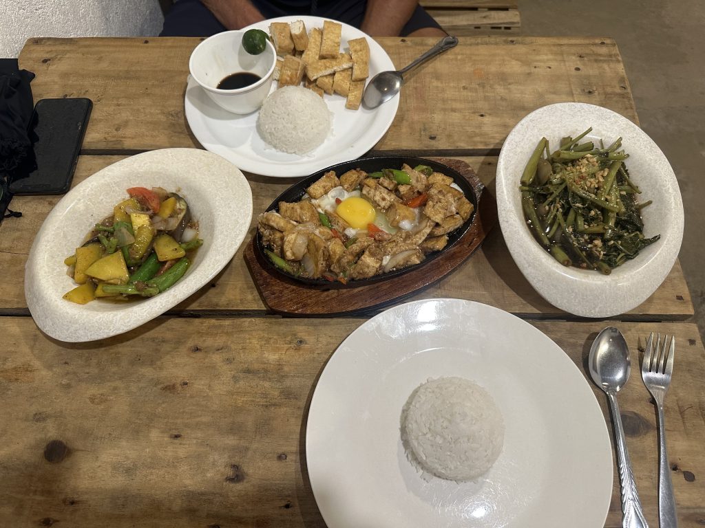 Für den letzten Abend habe ich dann nochmal ein Restaurant herausgesucht. Eigentlich laufen wir lieber selbst durch die Straßen und entscheiden spontan. Doch nach den letzten beiden Abenden, wollten wir mal wieder gut und möglichst günstig essen. In Sitio Calaan, etwas nördlich von El Nido Town, sollte es genau so ein Restaurant geben, welches auch Veggie-Gerichte anbietet. Und diesmal hatten wir wirklich Glück: Es gab für uns Fried Tofu, Pinakbet (ein klassisches philippinisches Gemüsegericht), Morning Glory Phili-Style UND Sizzling Tofu 😃