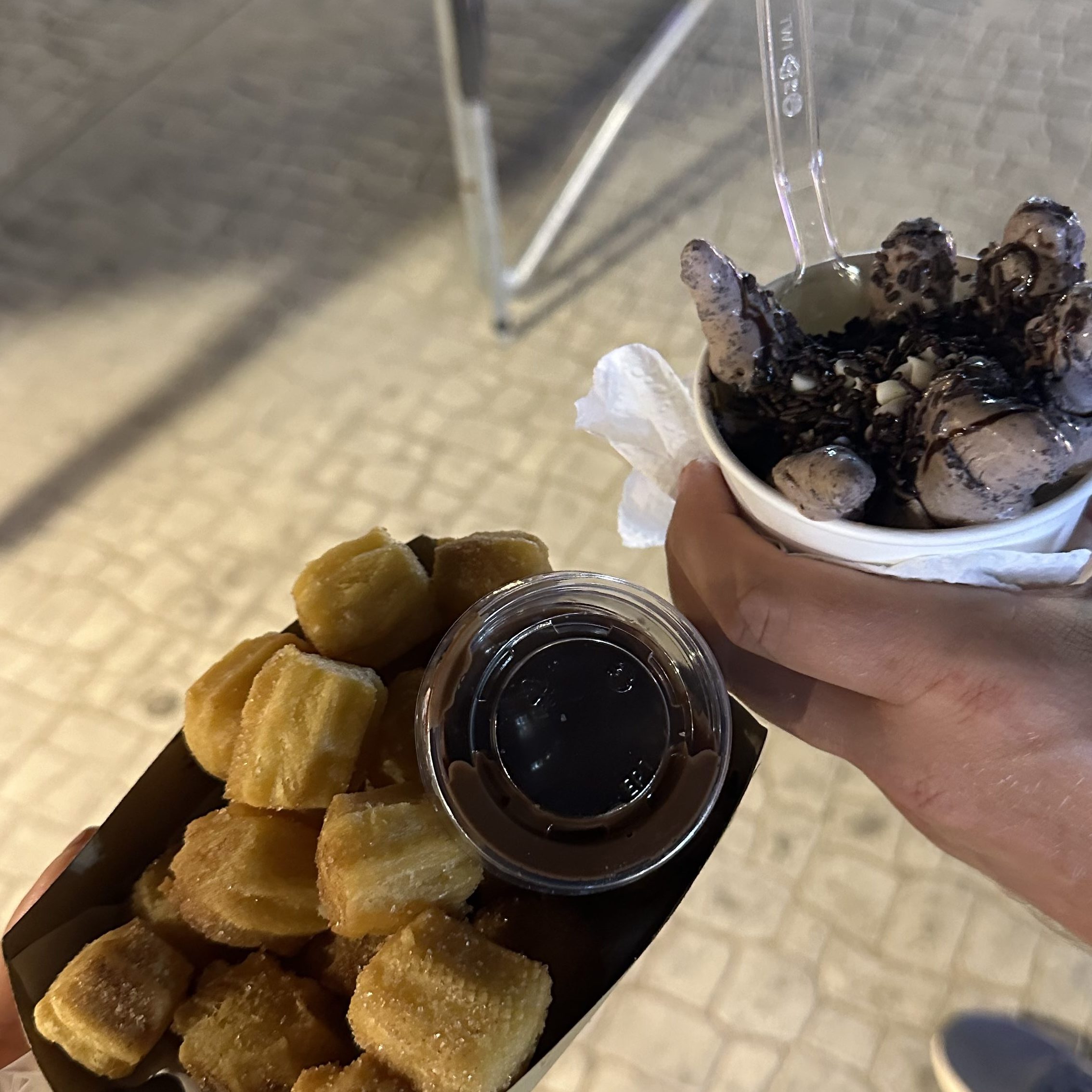 Zurück zum zweiten Gang: Brownie Roll Ice und Mini Churros als Schmalzkuchenersatz – lecker!