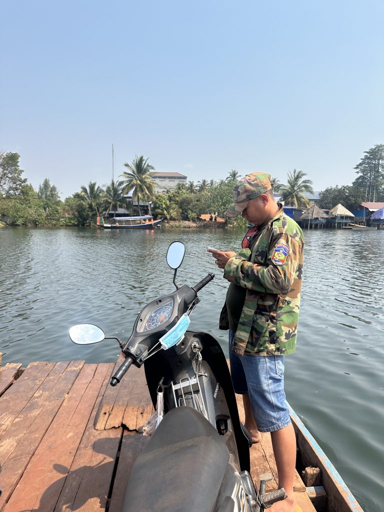 Und so standen wir da an der staubigen Straße an einem kleinen Kiosk und versuchten uns mit den Locals zu verständigen. Am Ende klappt es irgendwie immer und so saßen wir ein paar Minuten später jeder auf einem Roller, unser großer Rucksack vorne vorm Fahrer. Mit Maske, Helm und Visier gegen den Staub, ging es los. Die Fahrt führte über die roten Sandpisten Kambodschas ins Inland und dauerte etwa 40 Minuten. Dann mussten wir noch mit einem kleinen Holzfloß den Fluss überqueren, bevor wir Chi Phat erreichten. Hier ging es für uns erstmal ins Community Center, denn bei denen hatten wir uns per E-Mail angemeldet.