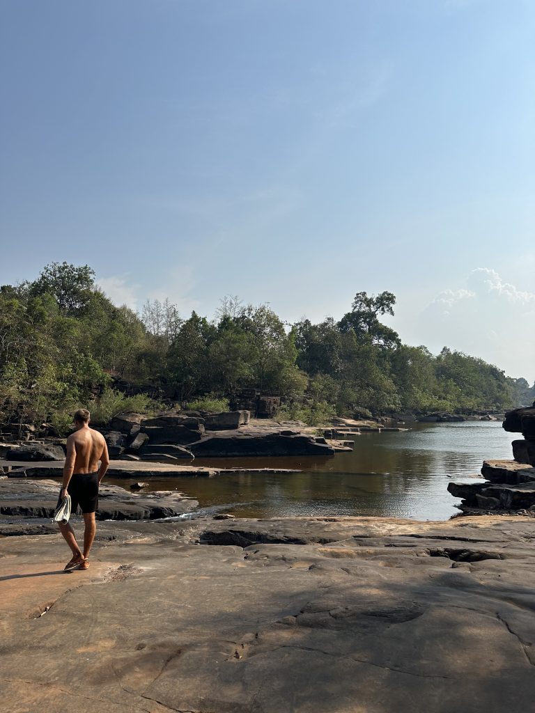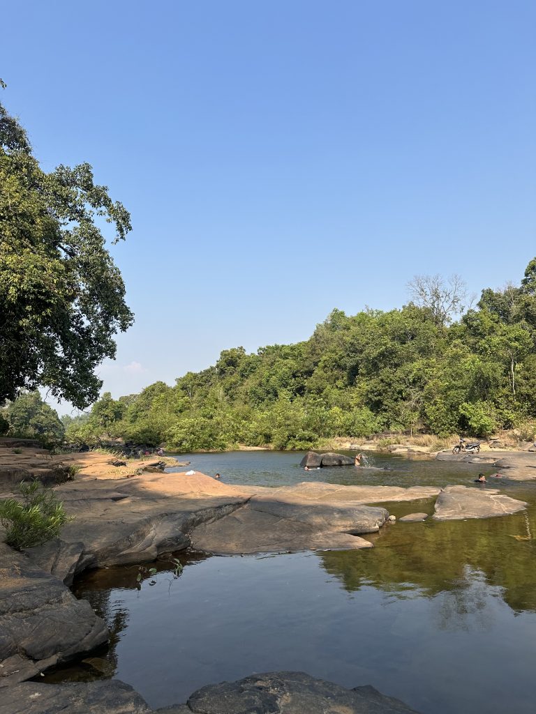 Von hier ging es weiter zum Chhay Chrey Waterfall. Hier gab es noch schön gefüllte Pools, in denen Freddy sich abkühlen konnte. Typisch Kambodscha: auf der einen Seite waschen die Locals Wäsche im Fluss, in der Mitte baden die Kids und auf der anderen Seite wäscht jemand seinen Roller 🤣 Alles bisschen anders hier.