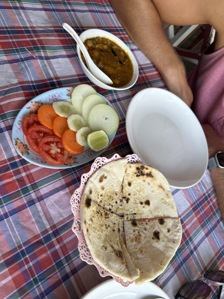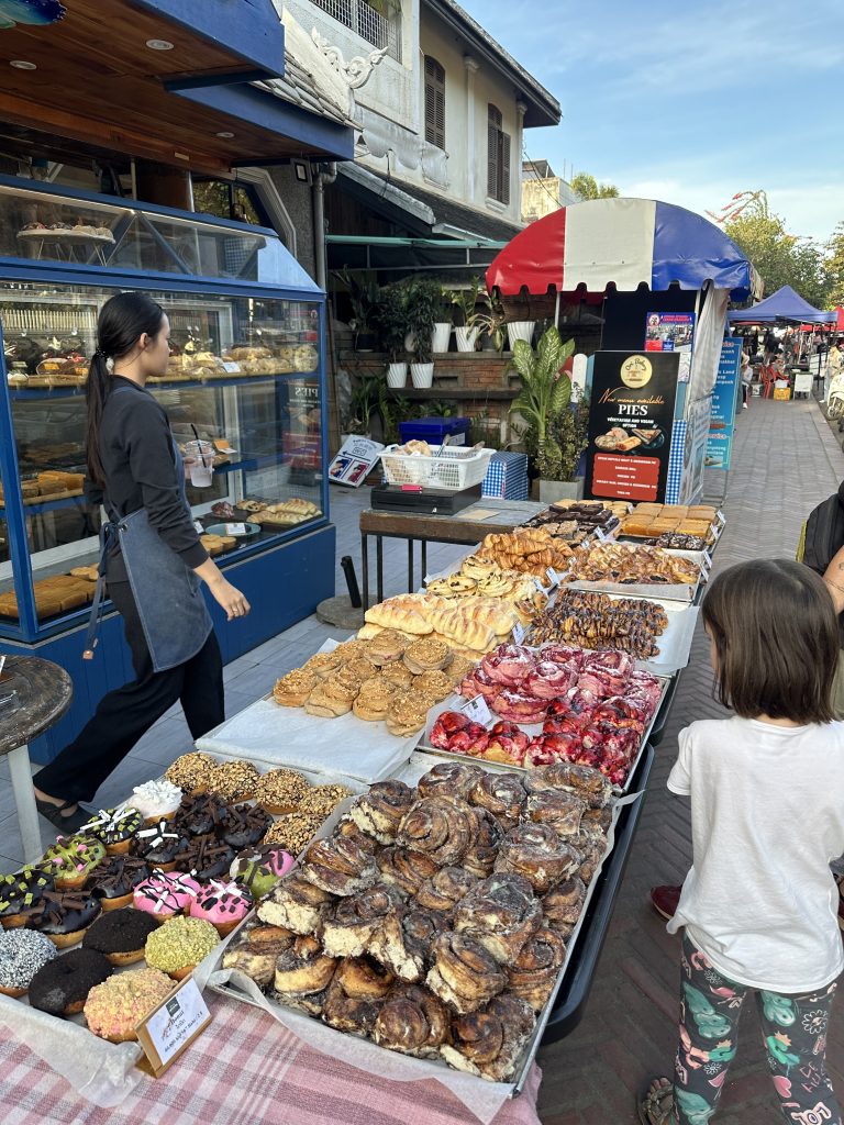 Um 18 Uhr haben wir uns dann am Nachtmarkt getroffen und ein richtig gutes All you can eat Veggie Buffet für 2€ genossen! Richtig gut. Und noch besser: ein weiteres Überbleibsel der Franzosen sind die ECHTEN Croissants. Hier gibt es einen Stand, der all diese guten verbotenen Gebäck-Leckereien anbietet: diverse Croissants, Zimtschnecken, Brownies, Donuts, Kuchen, sogar dänische Kuchen!! Wenn es sowas schon einmal gibt, müssen wir natürlich zuschlagen. Und so haben wir uns einen Mangocake, eine Zimtschnecke und ein Schokocroissant gegönnt. Und das war wirklich unglaublich lecker. Wenn es etwas nicht mehr gibt, wird es glaub ich automatisch zehn Stufen leckerer 😅 Preislich ist sowas natürlich etwas teurer, und so haben wir am Ende des Tages 4€ fürs Dinner und 6€ für den Nachtisch ausgegeben 🤣