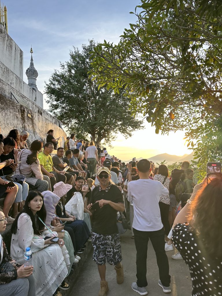 Von oben hat man wirklich einen tollen Blick über die Stadt, den Mekong und die Berge im Hintergrund. Wenn es doch nur nicht so voll wäre! Wirklich selten hab ich es so voll an einem Ort gesehen – da bleibt von schöner, entspannter Sonnenuntergangsstimmung nicht mehr viel übrig 😅