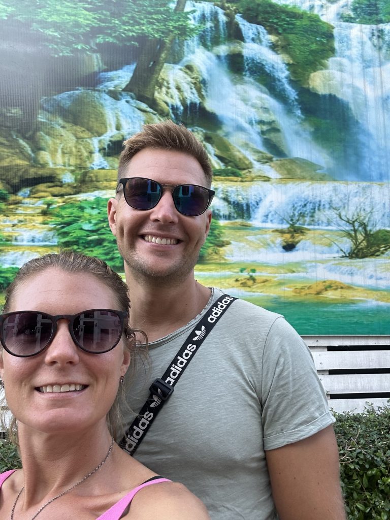 Am Mittag/Nachmittag wollten wir eigentlich den berühmten Kuang Si Waterfall ansehen. Auf Bildern sieht er richtig toll aus und ich wollte wirklich super gerne hin. Aber irgendwie haben wir so lange trainiert, sind auf dem Heimweg beim Supermarkt-Sightseeing versackt und wollten den Nachmittag am Ende irgendwie entspannt verbringen. Und so haben wir auch mal „Nein“ zu einem Ort auf unserer Must-See-Liste gesagt. Das ist (besonders für mich) gar nicht mal so einfach, aber etwas was man lernt – oder lernen muss – wenn man so lange auf Reisen ist. Man kann einfach nicht alles sehen. Immerhin ein Selfie vorm Wasserfall-Plakat haben wir 😝