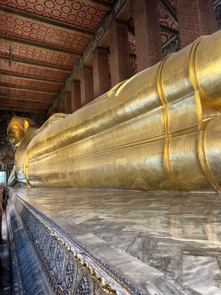 Lustigerweise waren Freddy und ich selbst noch nie im Wat Pho. Irgendwie war es uns da bisher immer zu voll und so krass an Tempeln sind wir ja auch nicht interessiert. Diesmal sollte es aber endlich so sein und wir besichtigten eines der Wahrzeichen Bangkoks und konnten den 46m langen liegenden Buddha auch mal aus nächster Nähe betrachten 😉