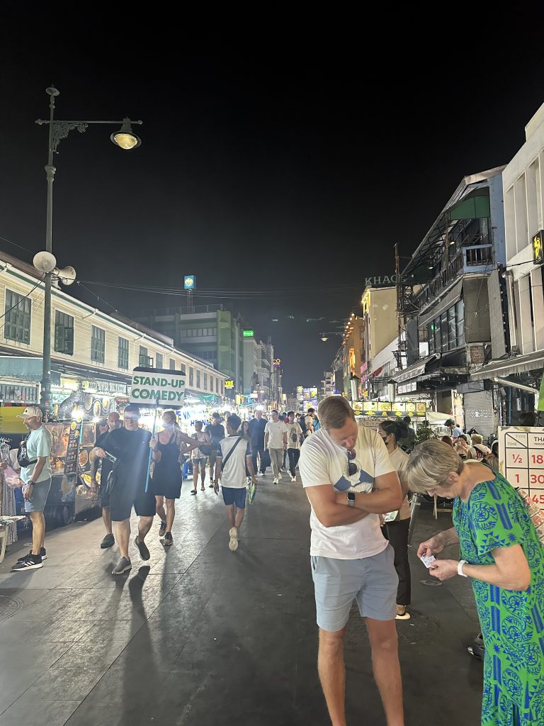 Im Anschluss ging es auch schon Richtung Khao San Road. Natürlich wieder mit der Orange Line. Auf der Khao San Road hat sich nichts verändert und es ist alles beim alten: viele Pad Thai Stände, getrocknete Insekten und Krokodil-Spieß. Bars, laute Musik und Plastikstuhlrestaurants am Ende. In genau so einem haben wir uns auch ein leckeres Dinner gegönnt. Zum Nachtisch gab es für Anke noch den allerersten Roti (mit Banana, und sie mochte ihn!). Zum Abschluss des Tages haben wir noch einen Absacker in einer Bar getrunken, bevor es standesgemäß mit dem TukTuk nach Hause ging 😄