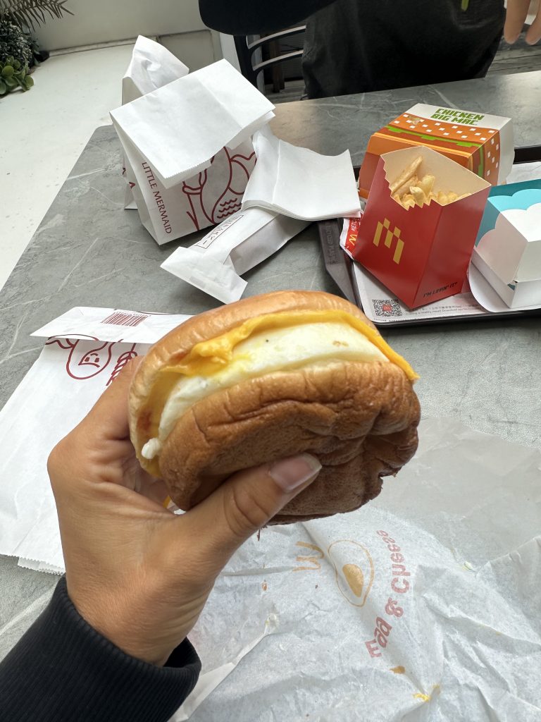 Wir haben schon wieder hunger. Wie gut, dass es in Hong Kong an jeder Ecke Bäckereien gibt. Und hierbei handelt es sich wirklich um richtige Bäckereien, in denen du richtig gutes Brot, Brötchen und Gebäck bekommst. Auf sowas mussten wir Ewigkeiten verzichten, kein Wunder also, dass wir uns mit ein paar Leckereien zum Lunch eindecken: Käsestange, Blaubeer Danish und Cinnamon Roll. Außerdem gehen wir das erste Mal seit Jahren zu McDonalds. Denn hier gibt es einen Egg & Cheese Burger; also auch was für mich 🤣 Freddy entscheidet sich für den Chicken Big Mac; gibt es bei uns auch nicht.