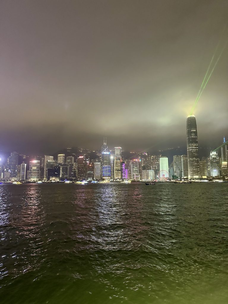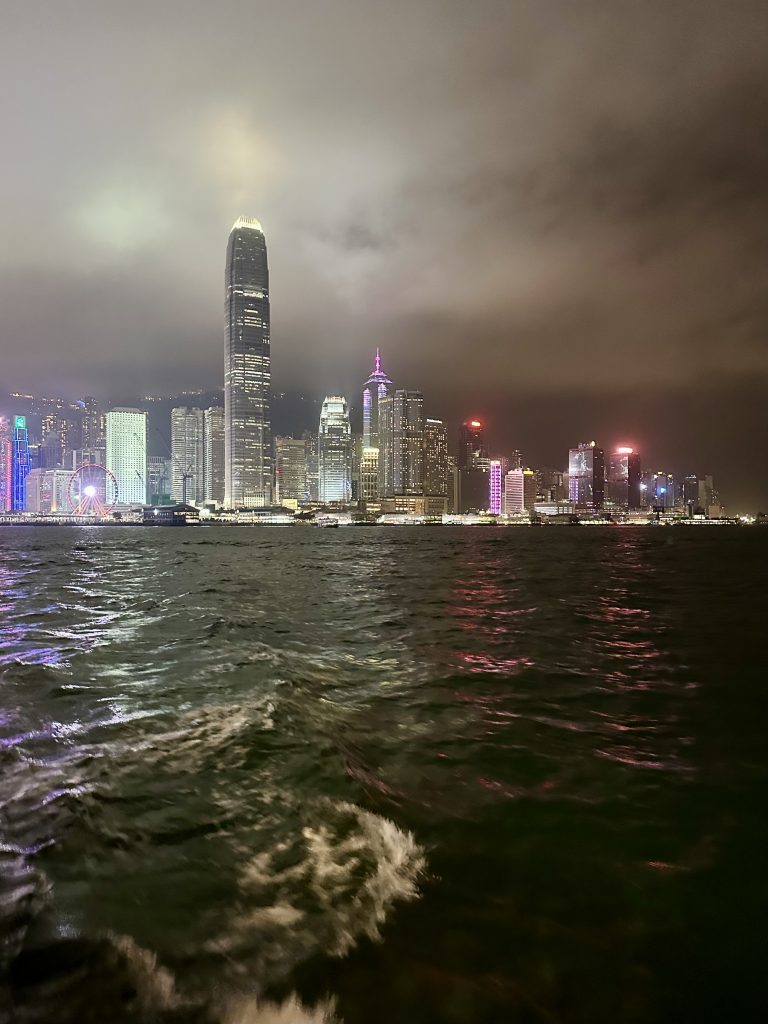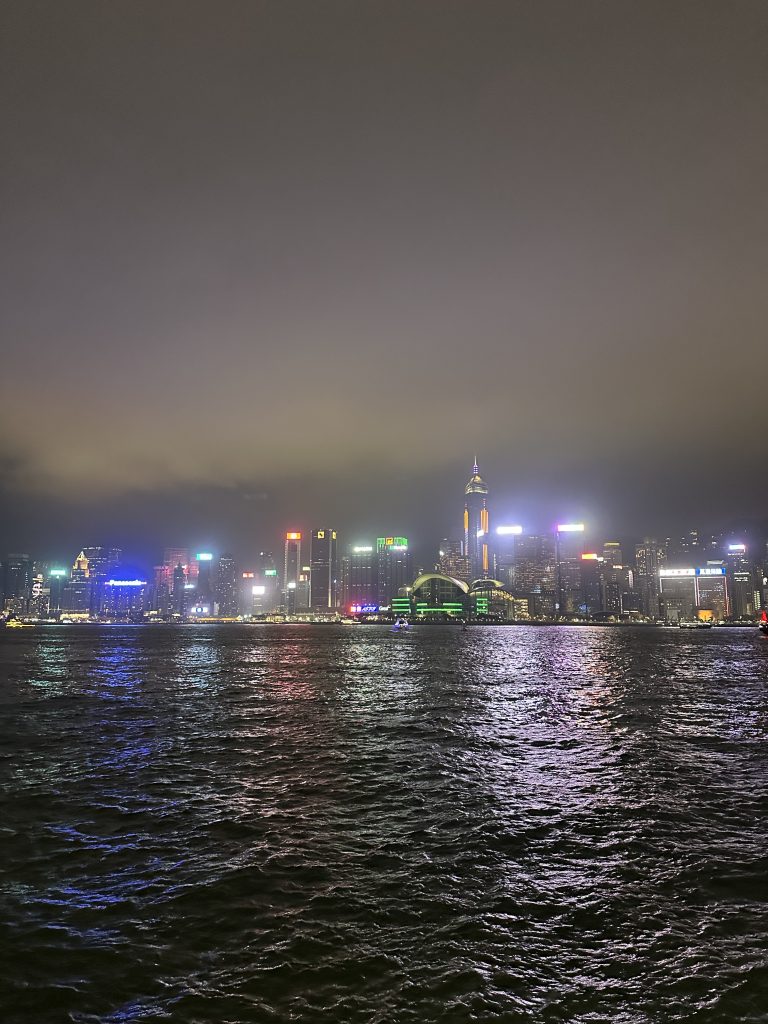 Zurück geht’s ein Stück zu Fuß, ein Stück mit dem Bus und dann wieder mit der Fähre nach Tsim Sha Tsui. Wir sind ein bisschen unter Zeitdruck, denn um 20 Uhr wollen wir unbedingt noch die berühmte „Symphony of Lights“ sehen. Just in time schaffen wir es – doch am Ende ist die Show leider eine ziemliche Enttäuschung. Da haben wir uns von dieser Stadt wirklich mehr erwartet.