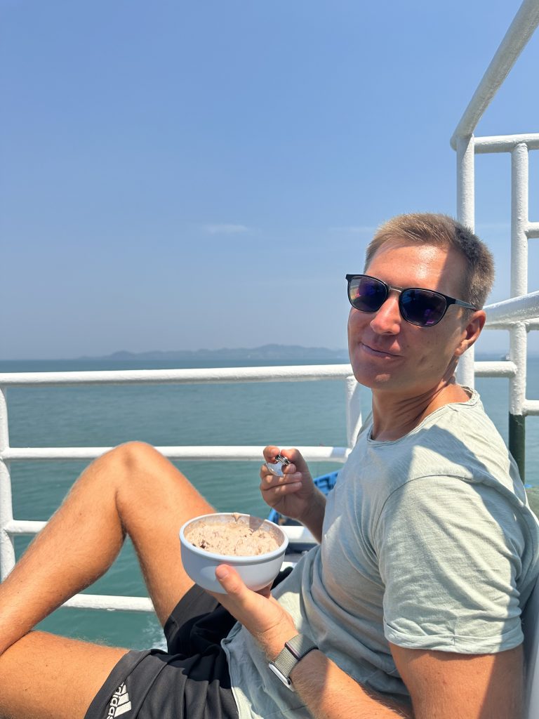 So mussten wir dann fast eine Stunde auf den nächsten Pick-Up warten, der uns dann aber für 50 Baht pro Person zum Pier mitnahm. Hier konnten wir dafür direkt und ohne Wartezeit auf die Fähre. Die 30 Minuten Fahrt haben wir genutzt, um zu frühstücken – Breakfast View mal anders.
