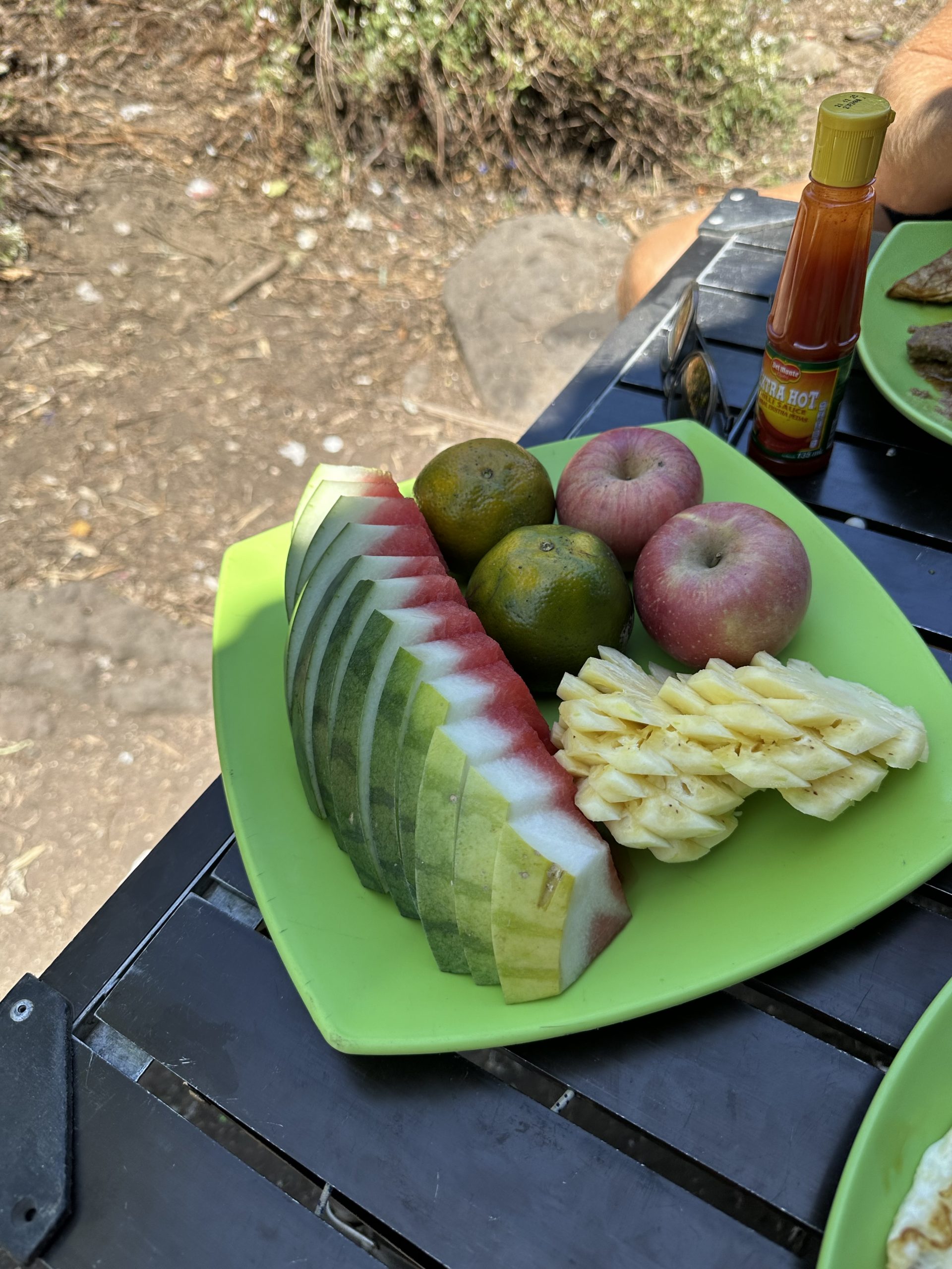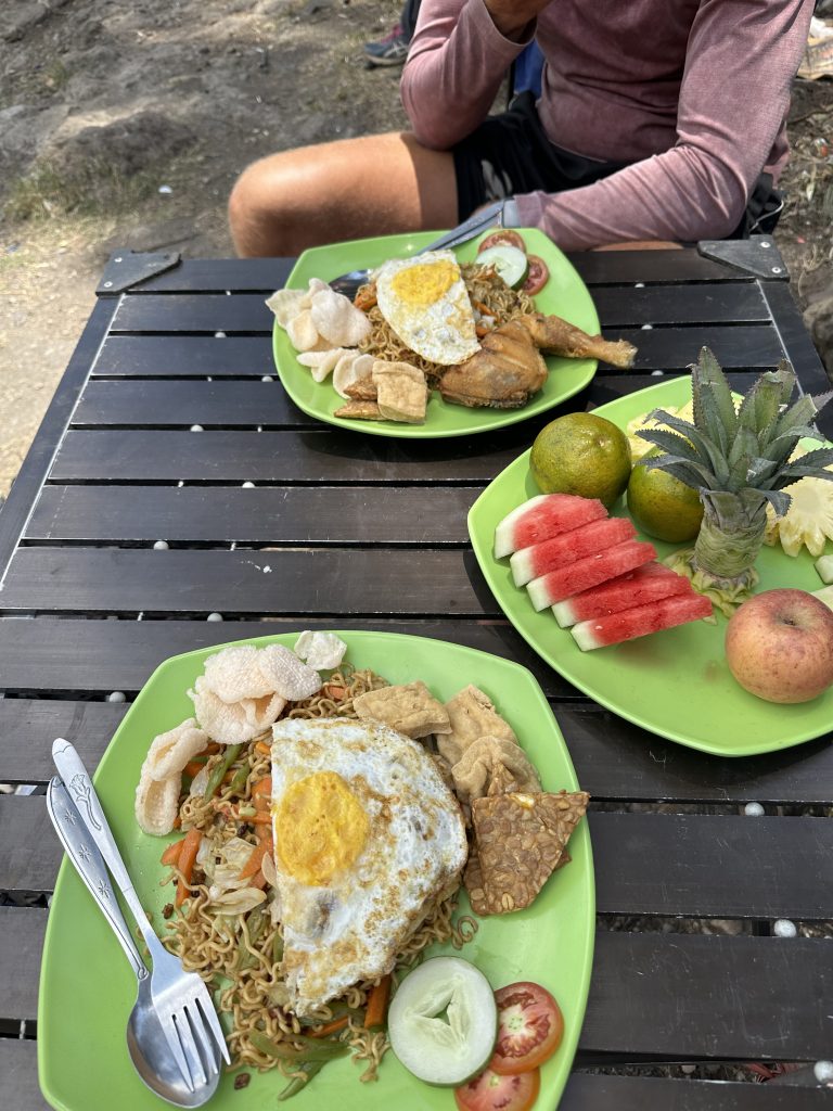 Die erste Etappe ging von 1.051m bis zur POS 3, Pada Balong, auf 1.800m. Der Weg war normaler Schotter und man kam gut voran. Und so kamen wir auch schon nach knapp zwei (statt drei) Stunden an und es gab das erste Lunch: Reis mit CapCay, Tofu, Tempeh & Ei. Für Freddy gab es zusätzlich Beef Redang. Außerdem: Ein riesiger Teller Fruits 😋