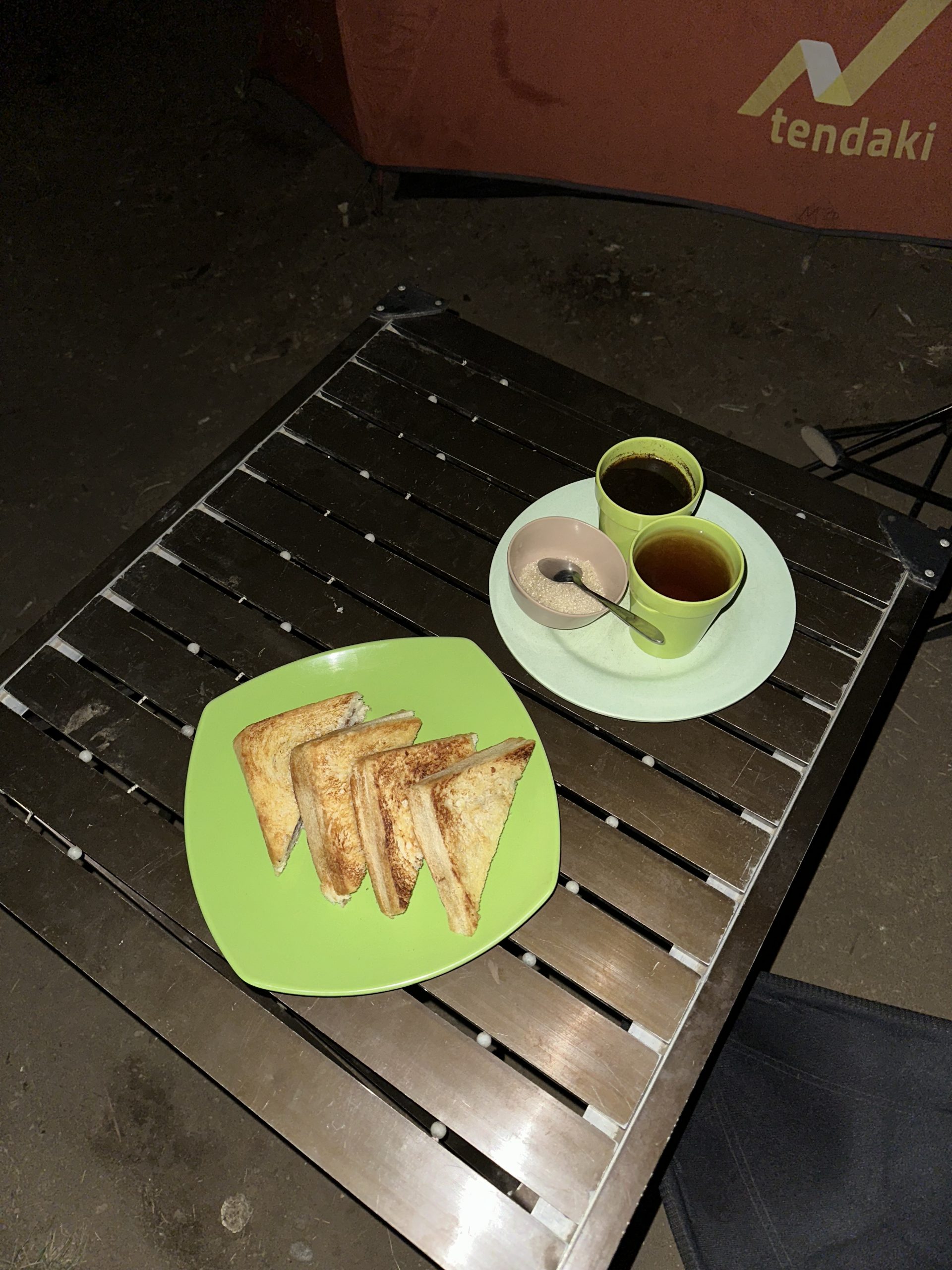 Das kleine Frühstück bestand aus Roti Bakar, also Toast mit irgendwas schokoladigem und Kaffee bzw. Tee. Und dann ging es um 2:52 Uhr los.