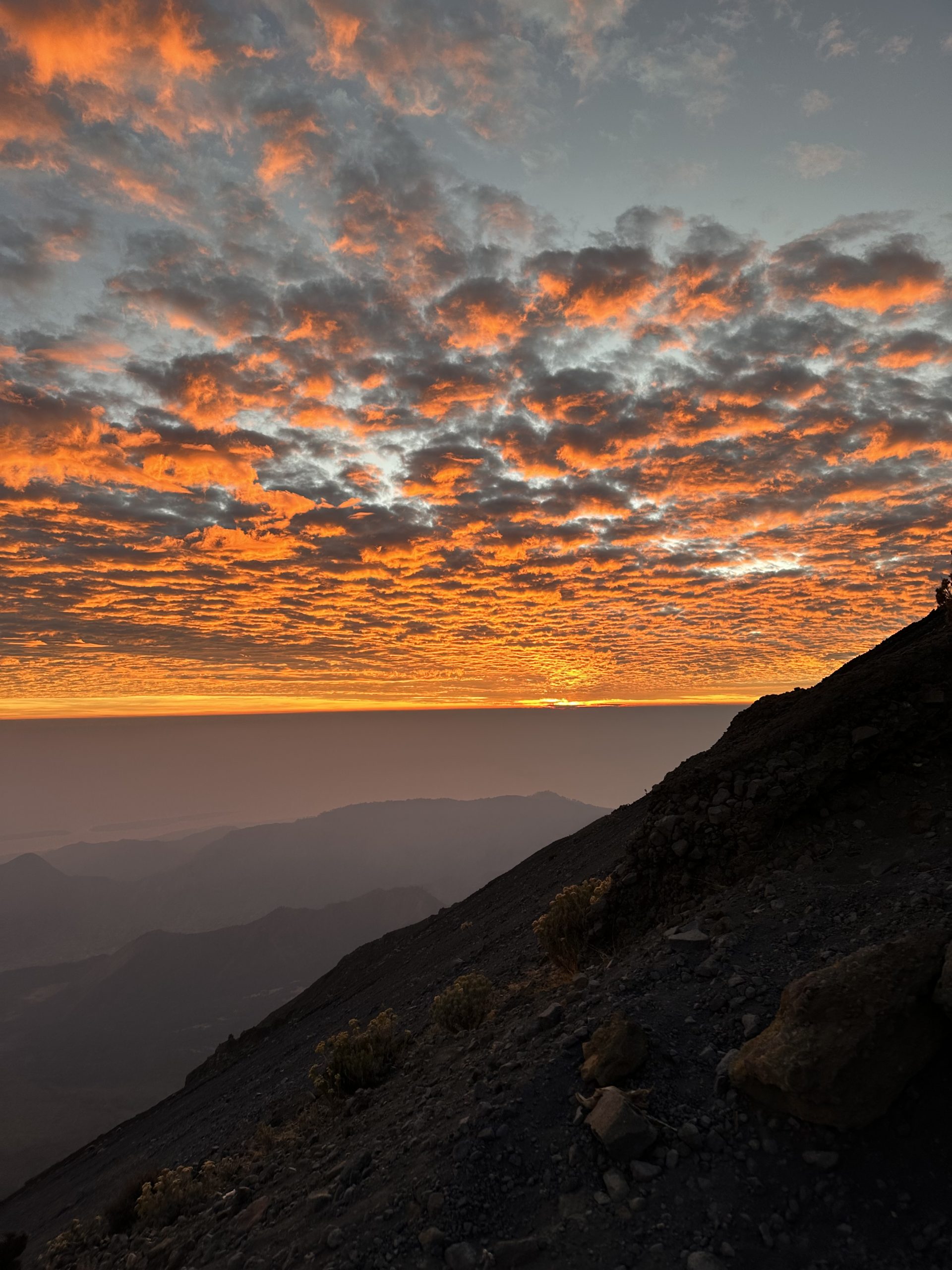 Das erste Stück verläuft extrem steil den Berg auf den Kamm hinauf. Der Weg ist sandig und man muss sich richtig mit den Füßen einhaken, um nicht nur zurückzurutschen. Es ist stockdunkel und über die eigene Stirnlampe kann man immer nur den nächsten Schritt sehen. Das ist ungewohnt, weil man sonst übers periphere Sehen total viel wahrnimmt. Nach gut einer Stunde extremer Anstrengung hatten wir den Kamm erreicht.