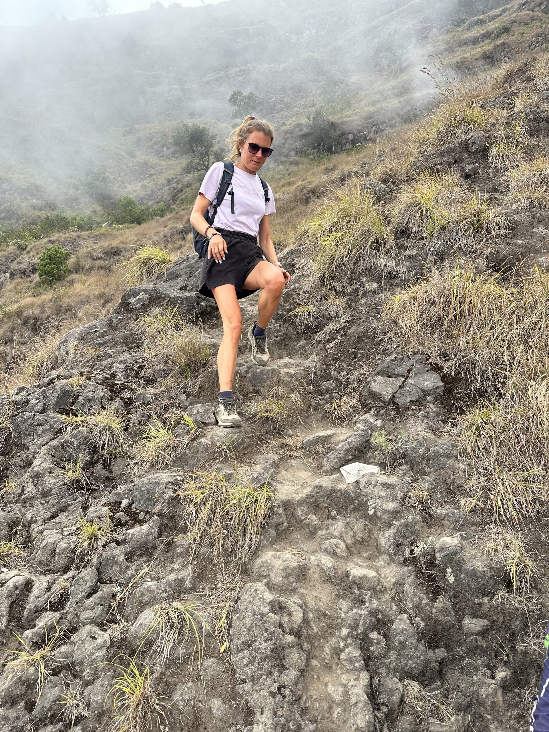 Nach der Gipfelbesteigung war der Wandertag für uns noch nicht zu ende. Denn wir hatten noch 7 weitere Stunden vor uns. Zuerst ging es 639m bergab zum Segara Anak Lake. Der Weg verläuft erst steil über Felsen am Hang hinab und wir mussten teilweise die Hände zur Hilfe nehmen. Später geht es dann durch Graslandschaft bis runter an den See.