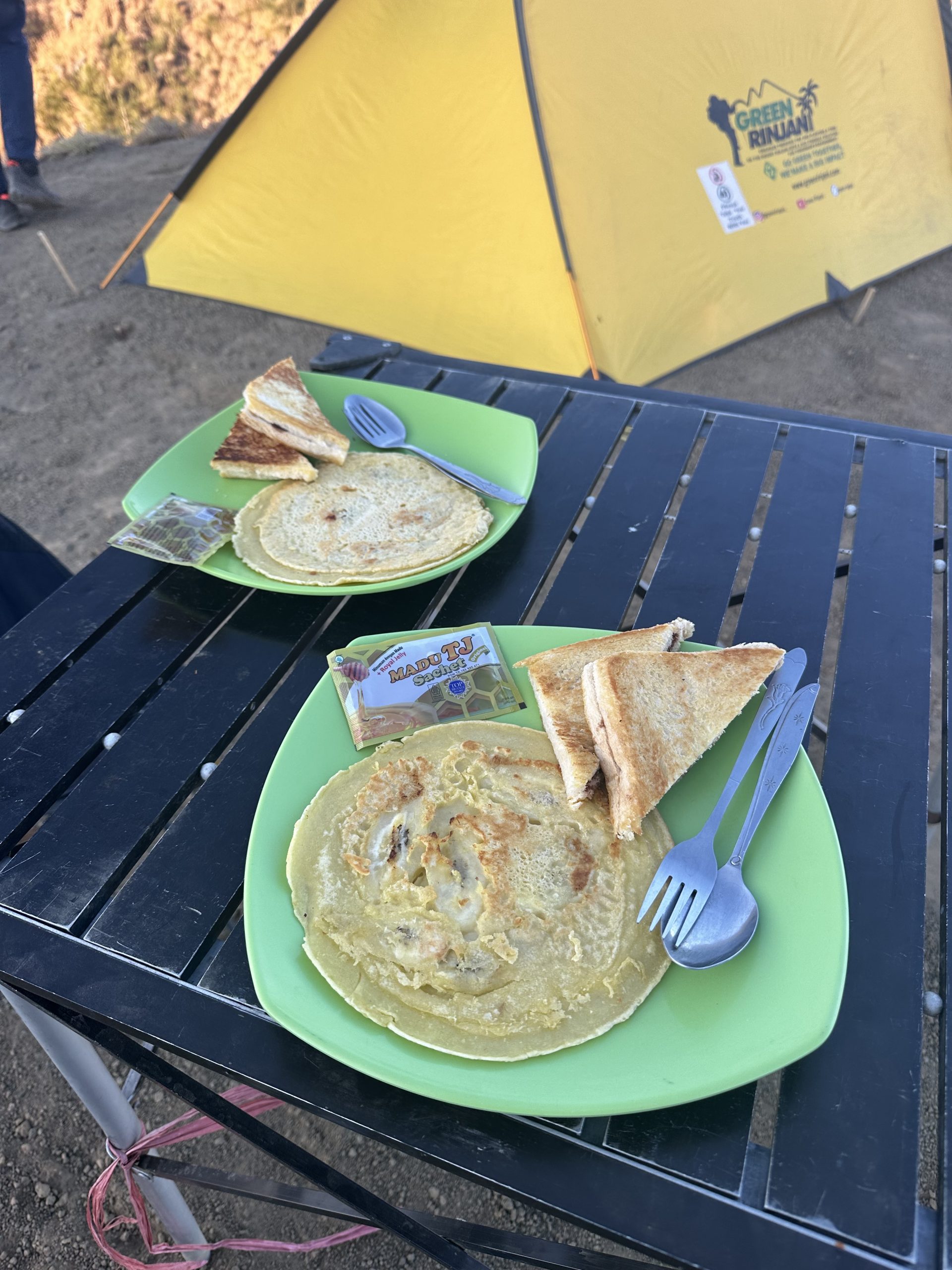 Es ging noch eine weitere Stunde rutschend über Sand und Geröll den Berg hinunter, bis wir gegen 08 Uhr wieder im Camp angekommen sind. Hier erwartete uns schon ein prächtiges Frühstück aus Vegetable Omelette mit selbstgemachten frischen Pommes und einem riesigen Teller Fruits – das war einfach nur himmlisch! Und diesmal hatten wir von hier auch einen tollen Blick auf den Kratersee 😍