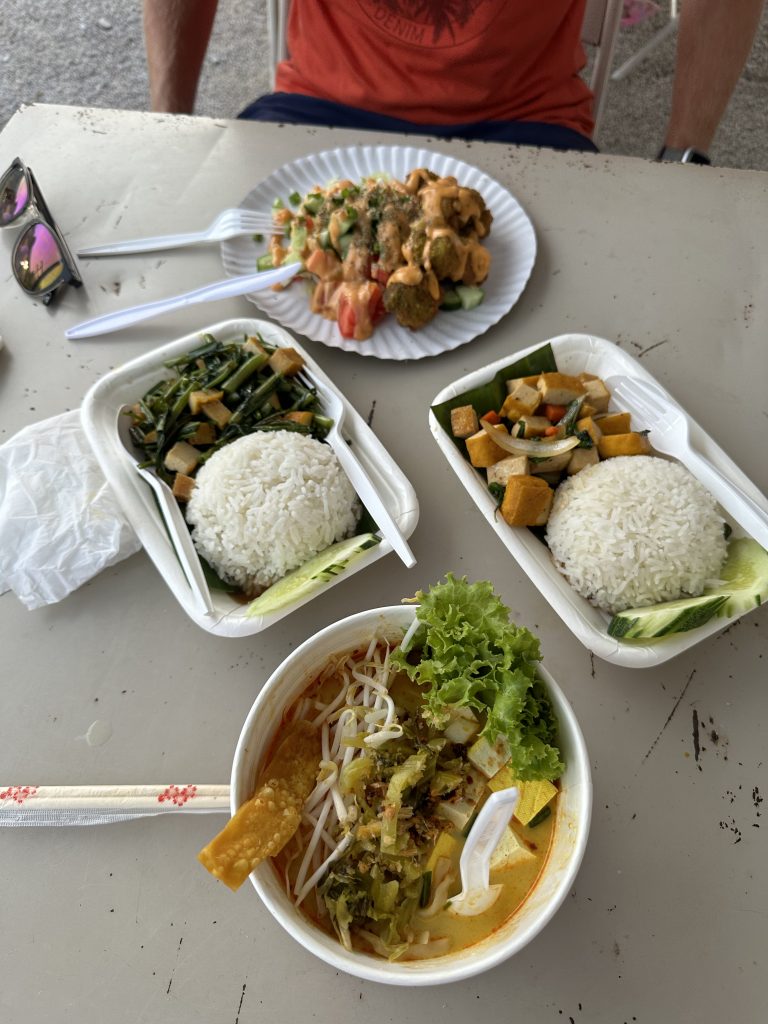 Ao Nang Landmark Nightmarket: Der Nachtmarkt ist relativ groß und bietet auch viele Essensstände – sowohl Snacks auf die Hand, als auch Stände mit Gerichten zum bestellen. Außerdem gibt es Sitzmöglichkeiten, was immer sehr wichtig ist 😀 Die Preise sind nicht ganz günstig, aber das liegt wahrscheinlich am Ort. Wir hatten Morning Glory Tofu, Tofu Basil, Veggie Kao Soi und einen Falafel Salat für insgesamt 290 Baht (ca. 8,30€).