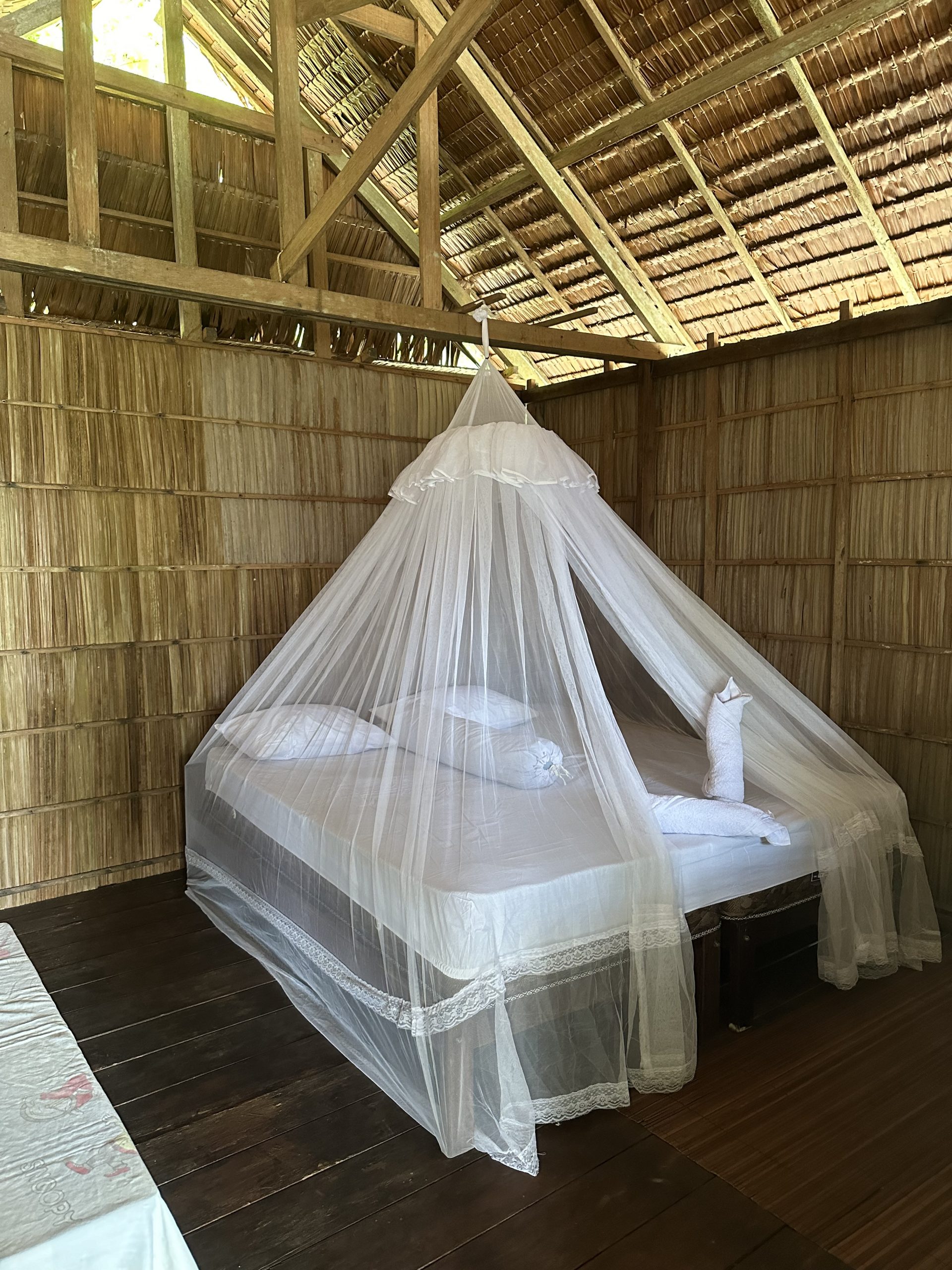Von Waisai wurden wir von unserem Homestay mit einem kleinen Boot abgeholt und es ging in knapp 45 Minuten zu unserer ersten Bleibe auf Pulau Gam. Das Raja Ampat Diva Homestay liegt an einem kleinen, aber feinen Strandabschnitt und hat nur zwei Bungalows. Der Bungalow ist super einfach und nur mit einem Bett ausgestattet, aber immerhin hatten wir ein eigenes Badezimmer. Sogar mit westlicher Toilette, aber ohne Klobrille (und natürlich auch Spülung). Trotzdem gab es einen Duschkopf (aus dem allerdings so wenig Wasser kam, dass ich meine Haare doch mit der Kelle gewaschen habe). Von unserer Terrasse hatten wir einen herrlichen Blick aufs Meer, welches auch nur 2 Meter entfernt war. Besser gehts nicht – and welcome to paradise.