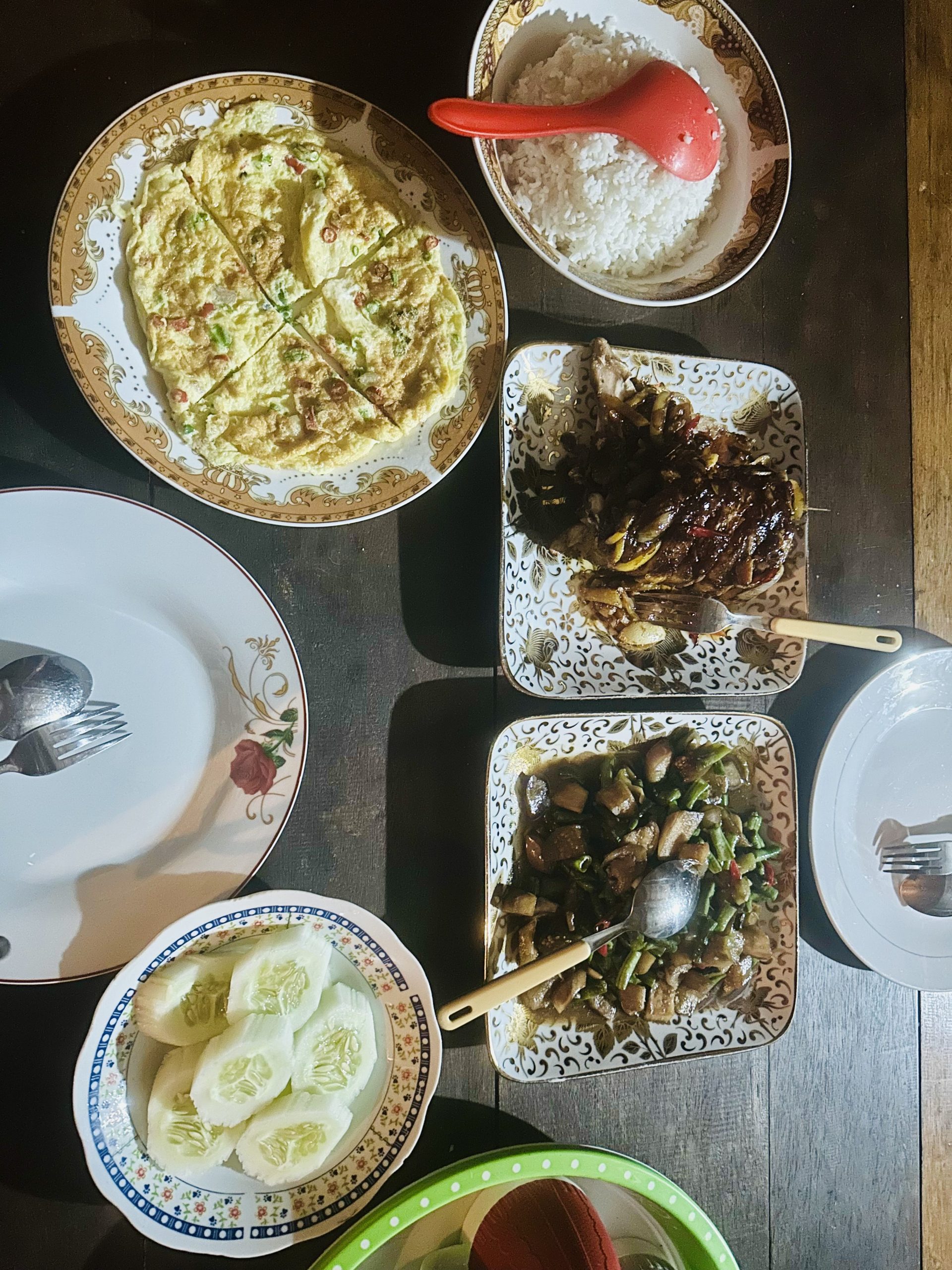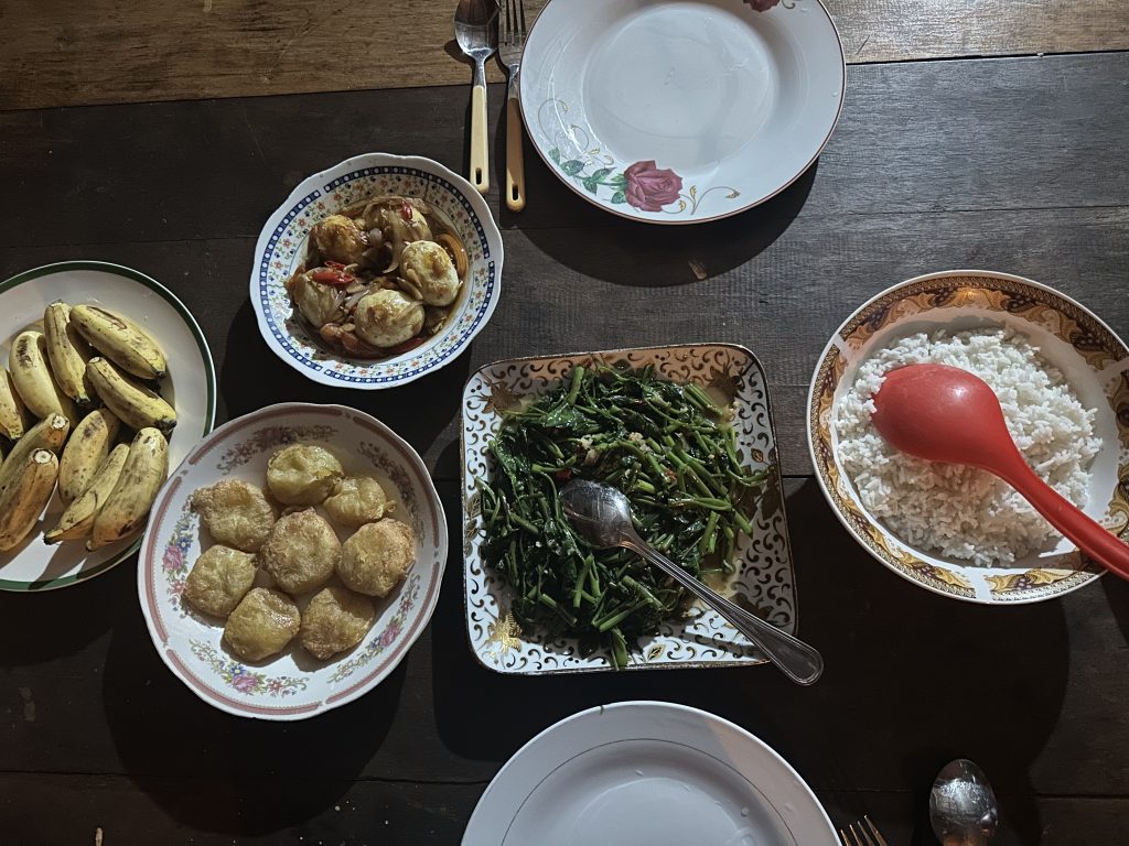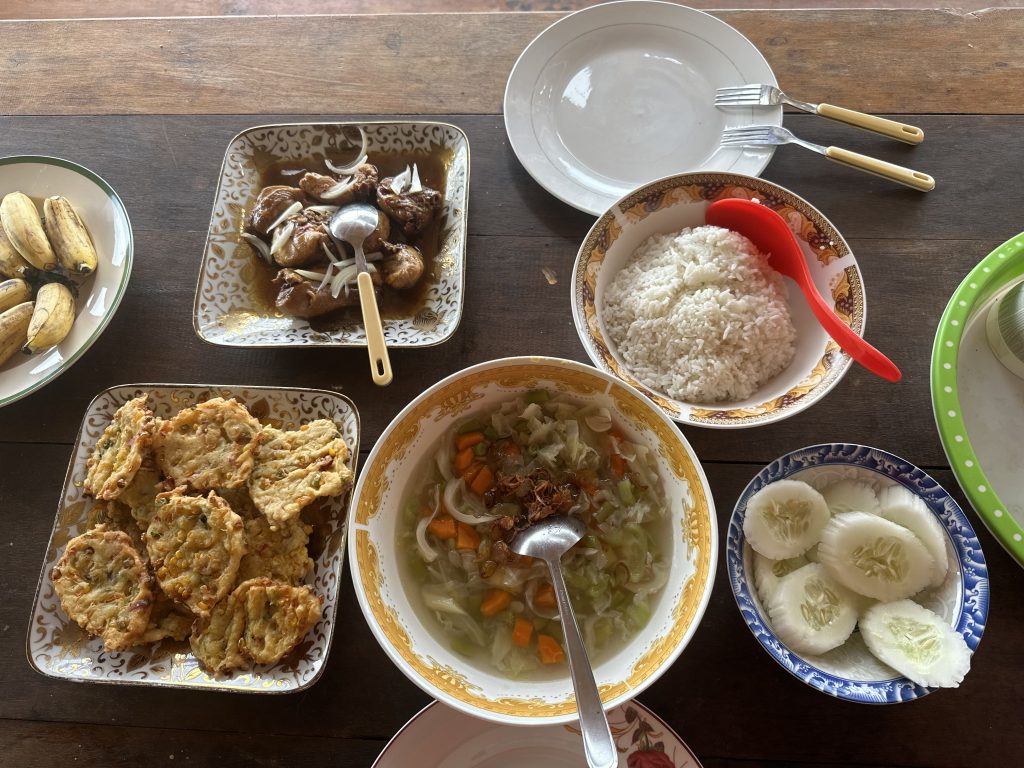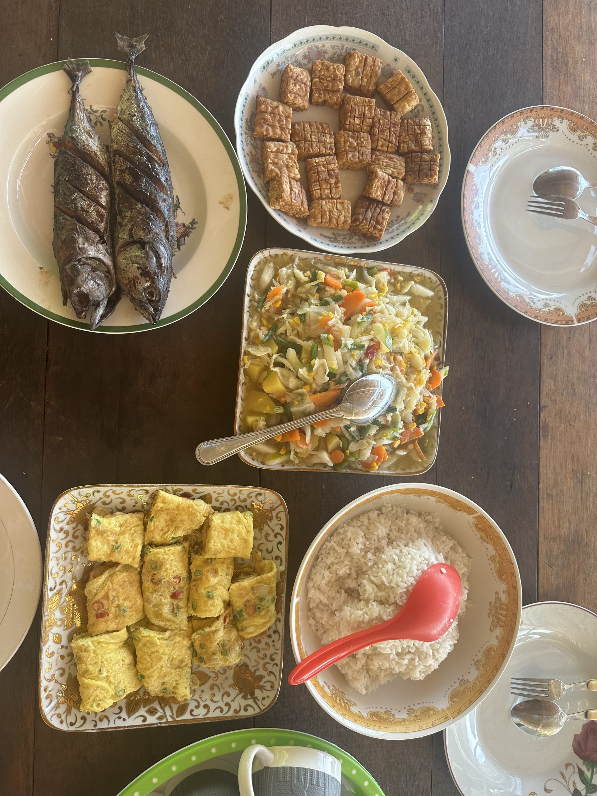 Wir waren sechs Tage hier und uns wurde bei jeder Mahlzeit etwas anderes serviert. Zum Frühstück gibt es hier meist süß, das heißt Fried Banana, Kue Padan oder Kacang-Küchlein. Zum Mittag und Abendessen gab es diverse Köstlichkeiten: Immer ganz viel Veggies, Tofu, Tempeh, Jagung Goreng, Omelette… für Freddy gab es frischen Fisch und einmal sogar Fleisch (das ist hier sehr selten). Und natürlich Reis 🍚 Die beiden Damen in unserem Homestay sind auf jeden Fall absolut grandiose Köchinnen.