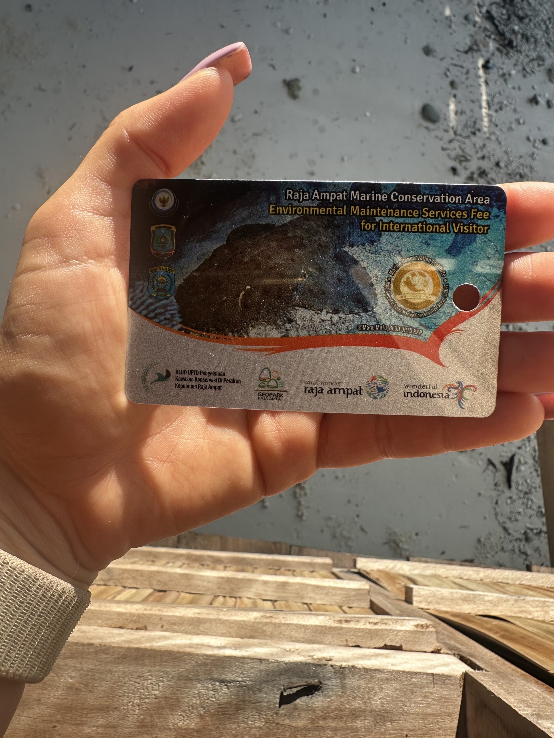 Am nächsten Tag ging es dann endlich los. Von unserem Hotel ab zum Hafen, und von dort mit der Fähre in guten zwei Stunden nach Waisai. Hier mussten wir uns dann erstmal registrieren und zwei Fees bezahlen: das Raja Ampat Visitor Entry Ticket für 300k IDR (ca. 17,50€) und das Raja Ampat Marine Ticket für 700k IDR (ca. 40€) pro Person, welches uns jetzt berechtigt ein Jahr den Marine Park zu besuchen. Man bekommt sogar eine richtig personalisierte Plastikkarte.