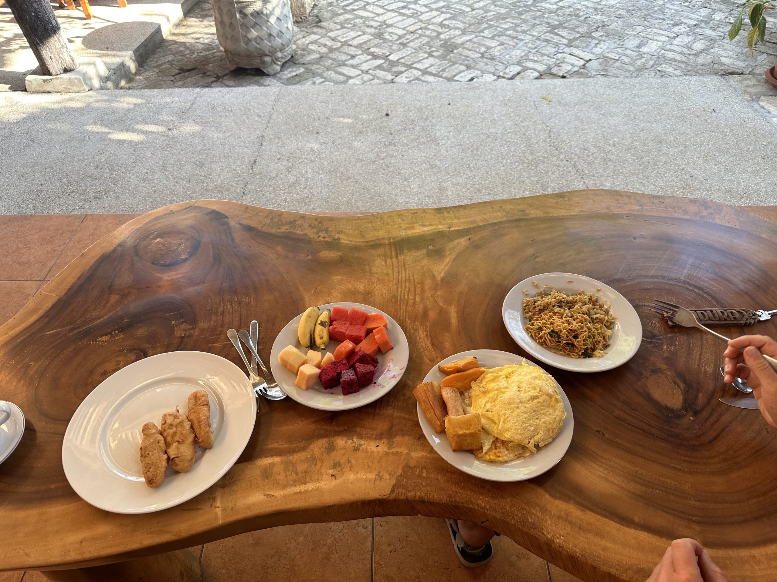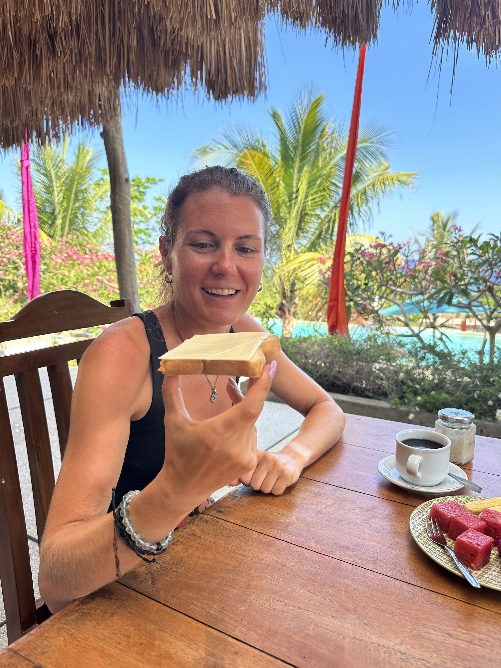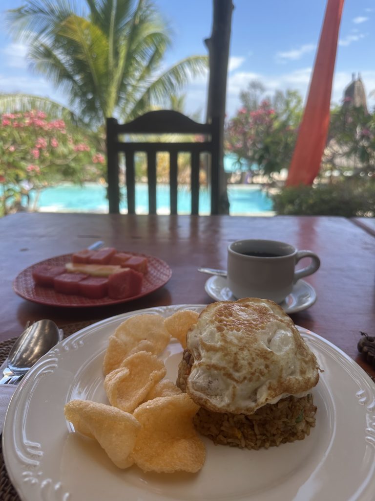 Den ersten Stop auf Sumba machen wir im Nordwesten, am Pantai Kita. Das Mario Hotel & Café liegt nur knapp 15km vom Flughafen entfernt. Und mit dem Hotel haben wir einen echten Glücksgriff gemacht: Es liegt direkt am Strand; von unserem Zimmer haben wir einen herrlichen Blick aufs Meer. Außerdem gibt es einen schönen Pool mit Liegen im Wasser 😃 das Zimmer, insbesondere das Badezimmer, ist auch mega – die Regendusche ist eine der besten Duschen, die wir jemals hatten!  Das Frühstück war grandios – man konnte sich so viel bestellen, wie man wollte: Omelette, Nasi und Mie Goreng, Pancakes, Fried Banana, Toast, Fruits und sogar Käse! Einen Tag gab es auch ein großes Frühstücksbuffet, weil eine große Gruppe da war 🤌