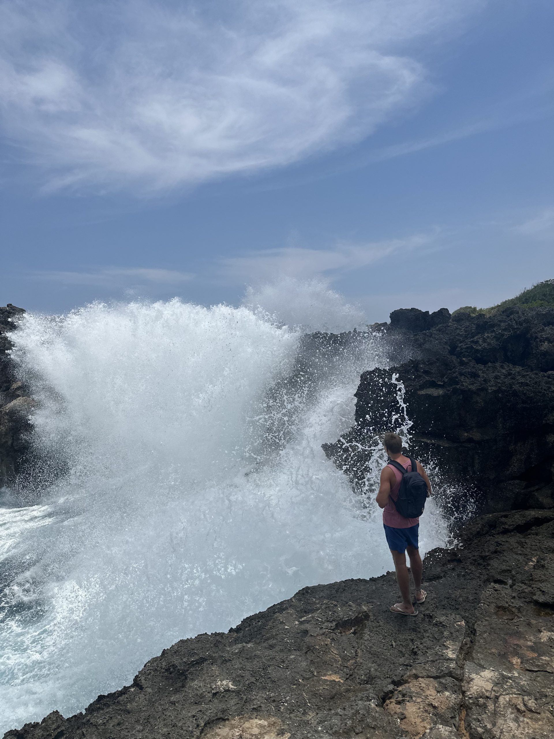 Die Waikuri Lagune ist einfach traumhaft. Die Farben des Wassers so schön und saftig, dass man direkt reinspringen möchte. Man kann zu Fuß einmal drumherum gehen und hat so viele tolle Blicke auf die Lagune aus unterschiedlichen Perspektiven. Am Küstenende gibt es ein Baby Devils Tear – was Freddy natürlich wieder total glücklich gemacht hat! Es kamen sogar richtig die großen Wellen reingeschossen. Beim Umrunden der Lagune läuft man teilweise über dem Wasser auf den Felsen und an der einen Seite gibt es eine große Felsspalte: Wenn die Welle unter dem Felsen das Wasser reindrückt, spritzt das Wasser und die Gischt aus der Spalte in die Luft. Spektakulär!
