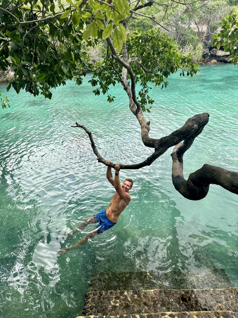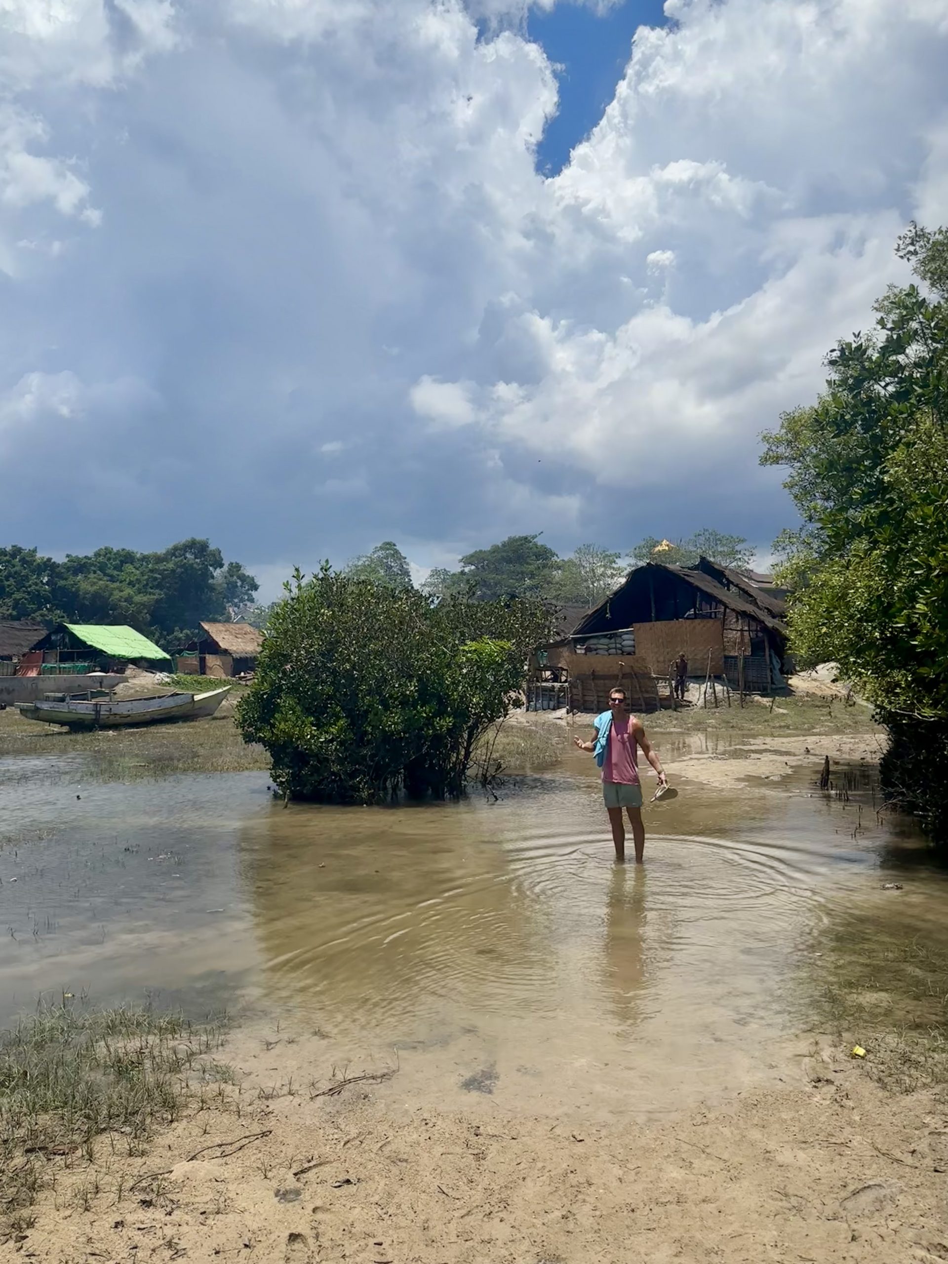 Das nächste Dorf östlich von unserem Hotel ist Katewel. Ein Mini-Fischerdorf direkt am Wasser. Wie immer haben wir unseren Roller relativ dicht am Strand abgestellt und uns an den Strand gelegt. Der Strand ist super schön, es gibt nur Sand und so kann man auch richtig gut baden. So entspannten wir schön, ich hab ein bisschen gelesen und als ich zu Freddy ins Wasser wollte, sehe ich auf einmal, dass der Roller weg ist. Und da wo unser Roller stand, steht das Wasser. Freddy kommt aus dem Wasser gerannt und geht zu unserem Parkplatz – die Locals winken schon. Sie haben unseren Roller weggestellt, denn wir Touris haben ihn in einer Senke abgestellt, die bei Flut vollläuft. Wie gut, dass die Einheimischen hier so freundlich und hilfsbereit sind und sich keinen Jux mit uns gemacht haben 🙏